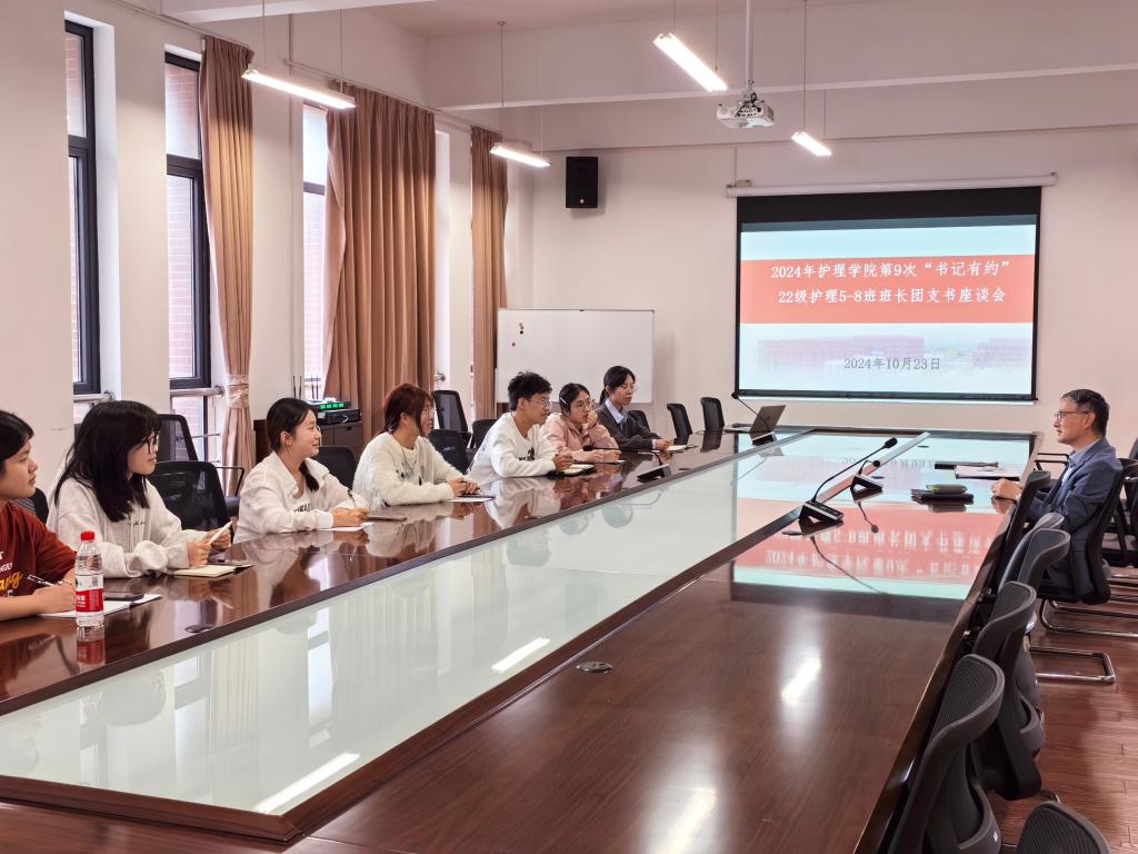 为了进一步了解22级护理专业5-8班更换辅导员后同学们和辅导员的磨合相处情况以及同学们进入大三后的学习生活情况,10月23日beat365中文官方网站党总支书记陈枫,学工秘书兼辅导员陈晓露,22级护理专业5-8班所有班长团支书在学院楼A213召开“书记有约”座谈会。会议由陈枫书记主持。