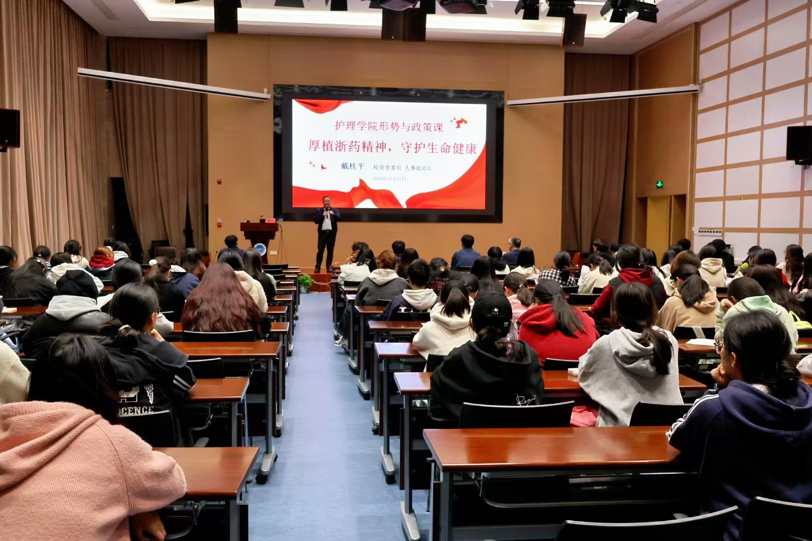 11月21日晚,护理学院在奉化校区行政楼111会议室举行“形势与政策”专题讲座,党委委员戴桂平受邀为护理学院学生讲授“形势与政策”专题讲座。护理学院党总支书记陈枫、辅导员王静雯、钱明星以及学院在校生代表参加讲座。讲座由护理学院党总支书记陈枫主持。