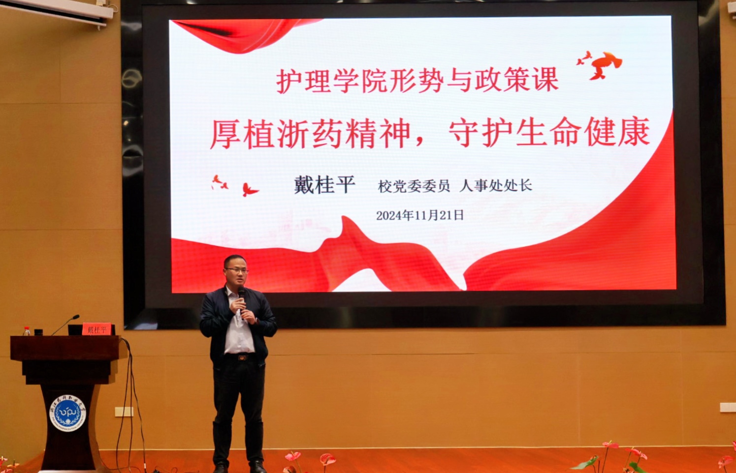 戴桂平围绕“厚德厚朴、励志远志”的校训从当前医药事行业就业形势,护理专业发展,生态平衡三个维度出发,提出“杏林育人,药泽天下”,强调护理事业要注重医药结合。戴老师同时向同学们介绍当今中国社会人群常见疾病以及相关政策,强调生命健康是人类生存与发展的基础。一个健康的身体,能够让我们拥有充沛的精力去追逐梦想、实现价值;而一旦健康受损,不仅个人会承受巨大的痛苦,家庭和社会也会因此蒙受损失。因此,作为未来的护理人员必须深刻认识到生命健康的重要性,时刻保持对健康的敬畏之心。