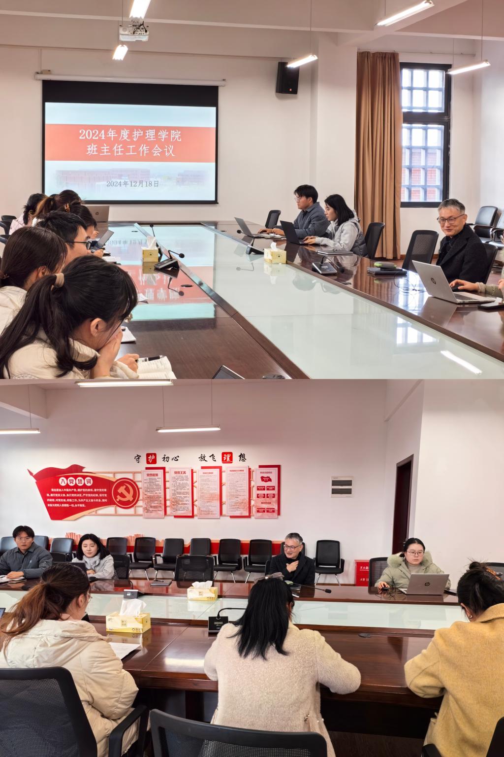 会议首先传达了多项重要工作指示。在考风考纪方面,强调要全力引导学生树立诚信应考的价值观,坚决杜绝作弊行为。在即将到来的考查课考试期间,要求全体教师以高度的责任感维护考场纪律,确保考试过程公正、透明,为学生营造良好的考试氛围。冬季安全工作成为此次会议的重点议题之一,学院对此高度重视,要求全体班主任在寒冬时节要进一步加强对学生的安全教育,严禁学生在宿舍内使用大功率电器,切实强化学生的安全防范意识,确保宿舍生活安全无虞。针对学生离校管理,学院计划提前精准掌握学生离校时间,将借助今日校园平台在学生离校前夕进行详细信息统计。同时,要求班主任督促学生如实告知家长离校时间与去向,防止出现失联现象,全方位保障学生安全离校。特殊情况下的请假申请必须严格遵循学校学院规定,以确保学院学生管理工作的有序进行,维护校园的和谐稳定。此外,会议特别关注学生心理健康与人际关系。随着考试临近,要求班主任密切留意学生心理变化,及时为学生缓解压力,预防心理问题的产生。同时,要积极关注学生之间的人际关系,妥善处理寝室内部矛盾,努力为学生营造和谐、积极的学习生活环境。