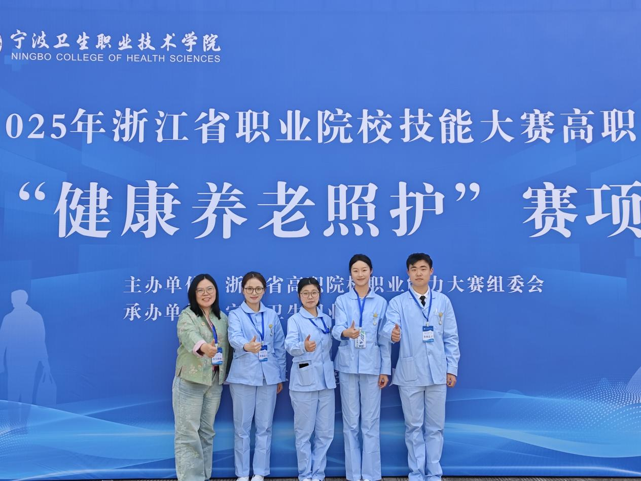 由梁娜、王思蒙老师指导的洪旗(A23 护理7班)、叶舒颍(A23 护理10班)、徐成玥(A23 护理9班)、马晓垚(A22 护理7班)师生团队在2025年浙江省职业院校技能大赛“健康养老照护”赛项中获得银奖。