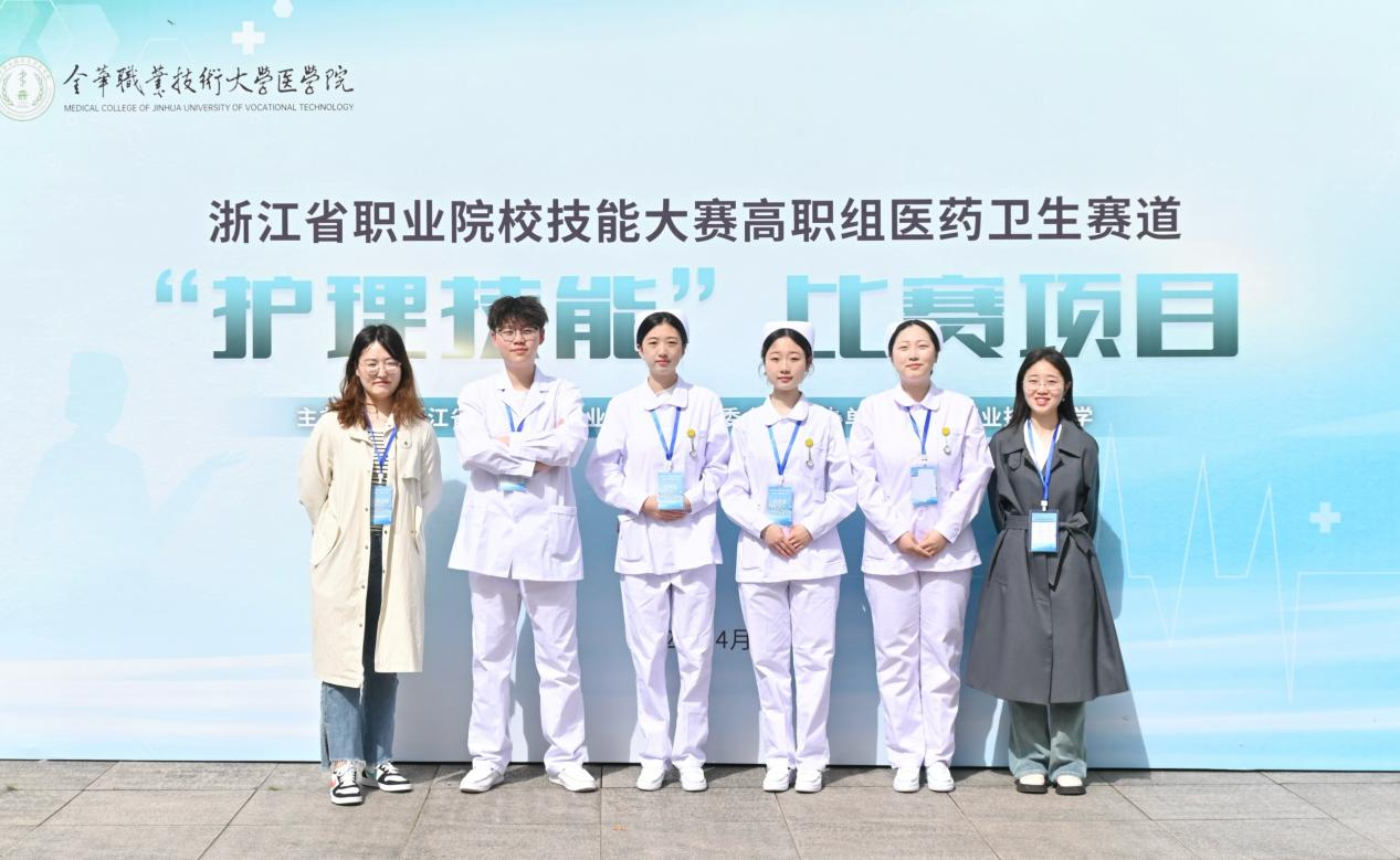 由王思蒙、陈钧卓老师指导的孙银卫(A22 护理7班)、盛雨涵(A22 护理8班)、王佳悦(A22 护理8班)、陈家怡(A22 护理8班)师生团队在2025年浙江省职业院校技能大赛“护理技能”赛项中获得铜奖。