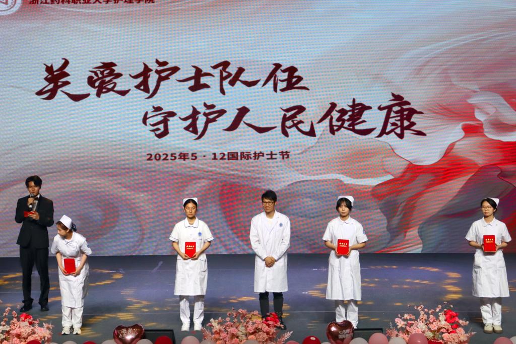 在随后的礼仪走秀环节,护理学生身着各式各样的专业着装,步履优雅地依次走过舞台,全方位展示了护理职业的良好仪态与独特风采,充分彰显了新时代护士的自信与专业素养,此外,晚会还举行了浙江药科大学护理技能大赛的颁奖仪式,对在大赛中表现卓越的个人予以表彰,以此激励同学们以优秀者为榜样,奋发向上,积极进取。最后,在深情悠扬的合唱《如愿》中,本次晚会圆满落下帷幕。这首歌饱含着护理学子对未来的美好憧憬,以及对社会主义事业的深情守护。